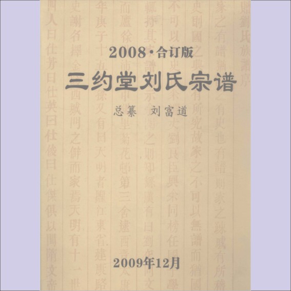 藏品名称:刘-湖北武汉-蔡甸区奓山街道樊里堡迁鄂刘氏2008版《三约堂刘氏宗谱》(合订版):刘富道总纂,本谱使