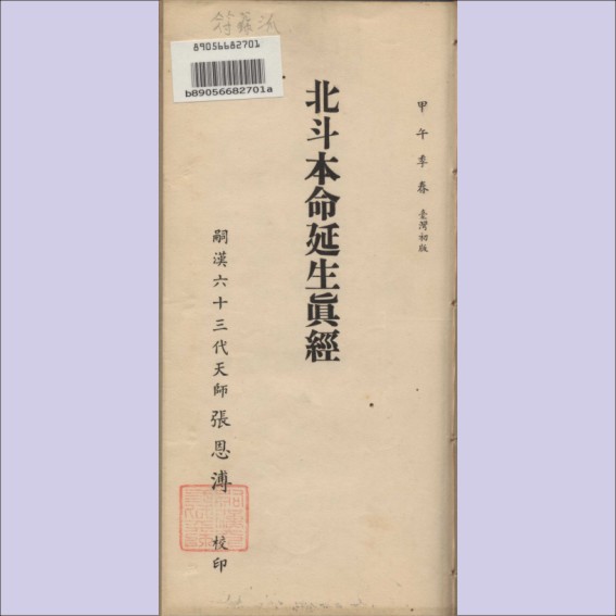 藏品名称:道教典籍《北斗本命延生真经》:嗣汉63代天师张恩溥校印,嗣汉天师府印行,1954年春台湾初版